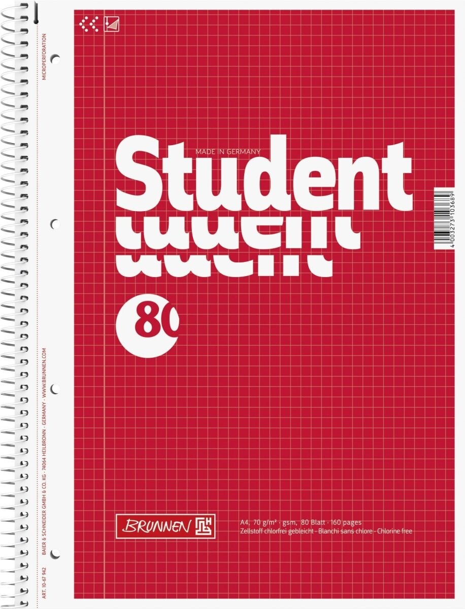 Brunnen Kollegblock Student A4 70g/qm kariert 80 Blatt rot Packung mit 5 Stück