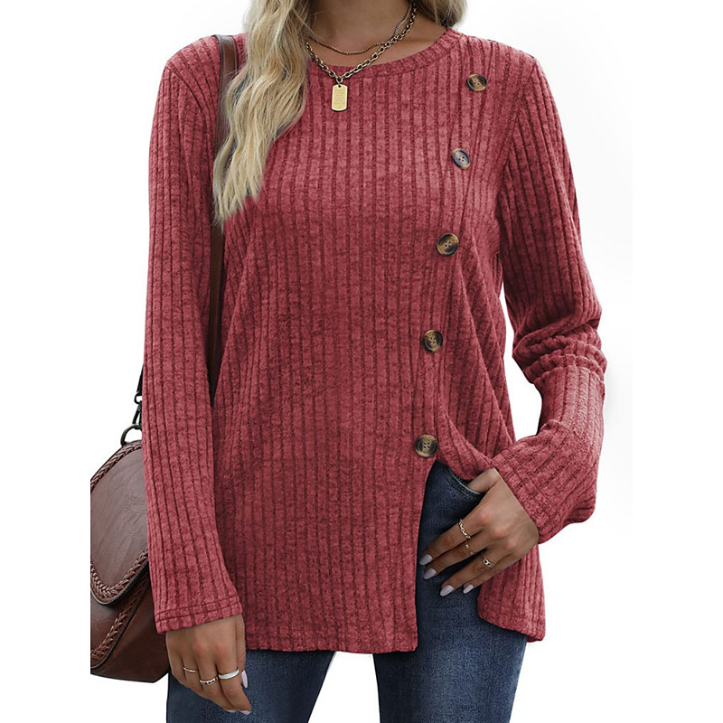 Women's Sweater Casual Soft Pure Color Ribbed Crew Neck Buttons Knitted Long Sleeve Regular Tops Knit Outdoor Daily Weekend Black Wine Fall Winter
