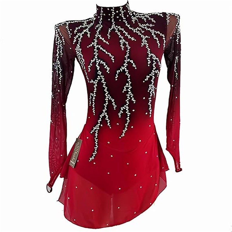 Figure Skating Dress Women's Girls' Ice Skating Dress Red Open Back Asymmetric Hem Mesh High Elasticity Training Competition Skating Wear Classic Crystal / Rhinestone Long Sleeve Ice Skating Figure