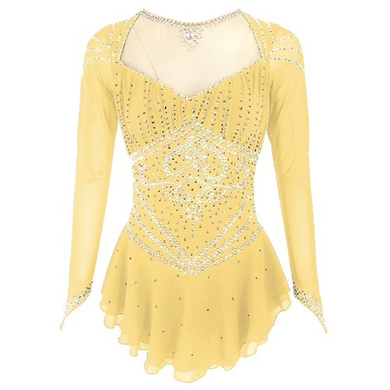 Figure Skating Dress Women's Girls' Ice Skating Dress Yellow Patchwork Thumbhole Spandex Mesh High Elasticity Training Competition Skating Wear Classic Crystal / Rhinestone Long Sleeve Ice Skating