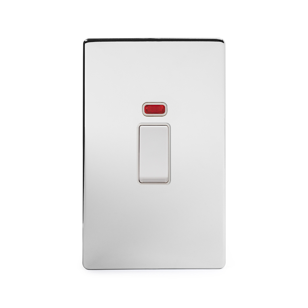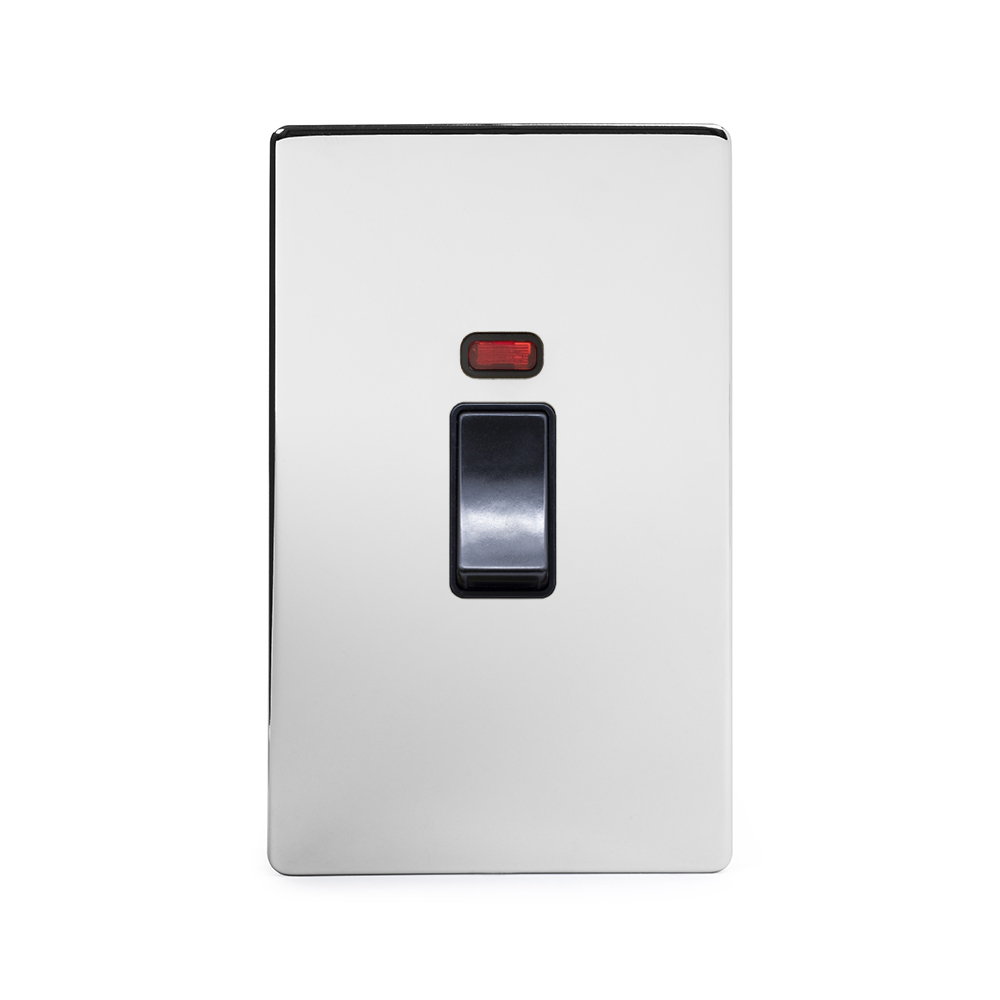 Soho Lighting Polished Chrome 45A 1 Gang Double Pole Switch With Neon Large Plate Blk Ins Screwless