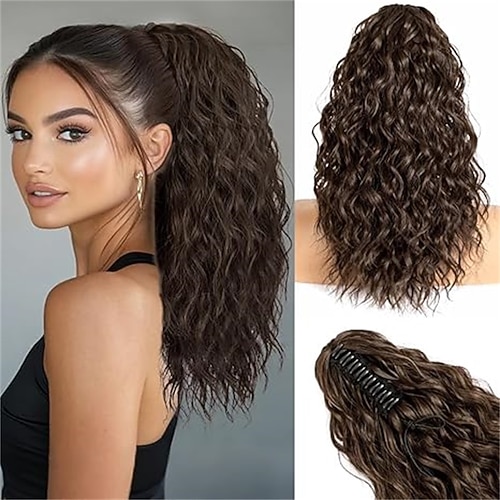 Braune Pferdeschwanzverlängerung, 45 cm (18 Zoll), lockig-wellig, mit Clip-in-Befestigung, mehrlagig, flauschig, natürlich aussehendes Kunsthaarteil für Damen (dunkelbraun), 45 cm (18 Zoll).