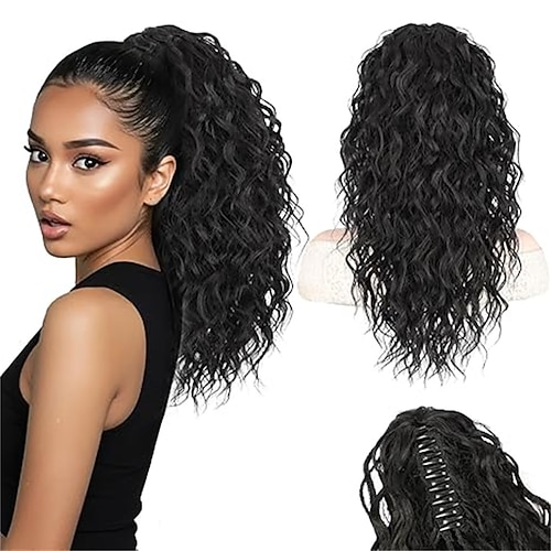 Haarverlängerung mit Haarspange für Damen – 45 cm lange, lockige, schwarze Haarverlängerung mit Kordelzug, starker Halt, flauschige, natürlich aussehende Kunsthaarteile für den täglichen Gebrauch