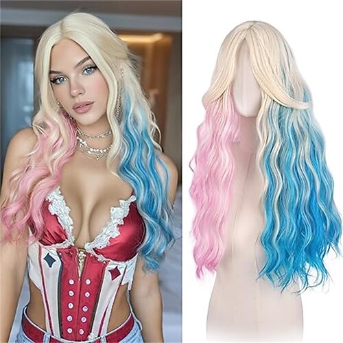 Pinkfarbene Perücke mit Pony für Damen – lange, gewellte, mit Mittelscheitel versehene, natürlich wirkende Kunsthaarperücke für Alltag, Partys, Cosplay und Kostüme, 66 cm (26 Zoll)