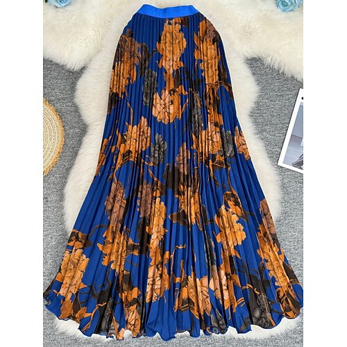 Per donna Vintage Moda Casual Maxi Vita Alta Gonne Floreale Pieghettato Stampato Micro-elastico Quotidiano Data Blu Nero Bianco Rosso Estate Poliestere