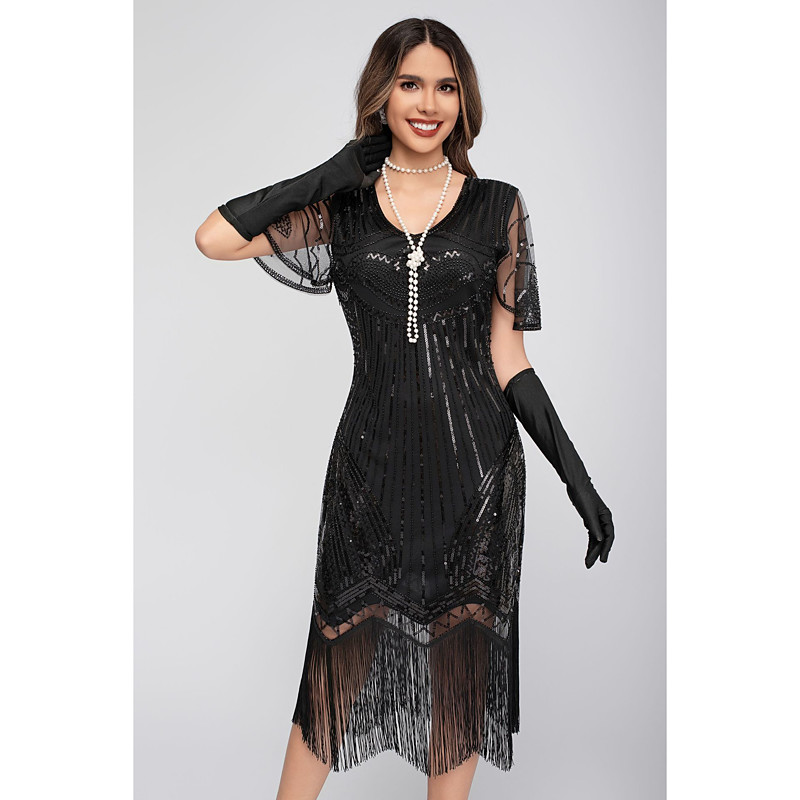 Retro Vintage Roaring 20s 1920s Knee Length Flapper Dress Outfits Accessories Set Short Sleeves The Great Gatsby Wedding Guest Sequins Tassel Fringe Sequin Tassel V Neck Fancy Dress Women's Carnival