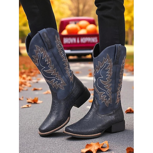 stivali da cowboy western da donna con cuciture ricamate – stivali in similpelle a metà polpaccio per festival autunnali, lavori agricoli e abiti da campagna