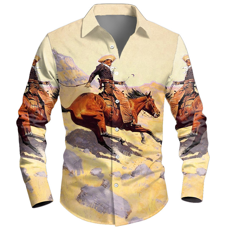 Men's Mountain Cowboy Riding Horse Shirt Western Shirt Cowboy Shirt Long Sleeve Vintage Retro Casual Outdoor WorkWear Spring Fall Turndown 3D Print Button Up Shirts Pink Purple Khaki