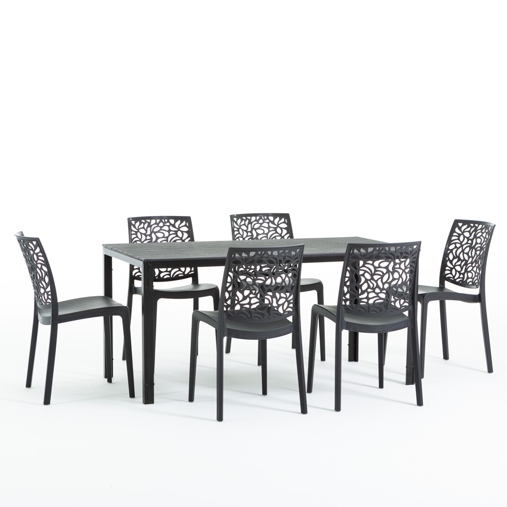 RATTATAN Gartenset mit Tisch und 6 Stühlen, rechteckiger Tisch mit Eisenstruktur und einteilige, stapelbare Stühle aus Harz – Thomas+Anna/Schwarz-Schwarz