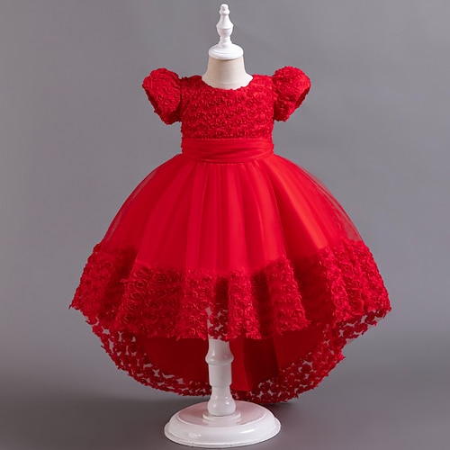 Abito da damigella d'onore bambina Ragazze Abito formale Abiti da sposa Feste Matrimonio Formale Adorabile Formale Principessa Rete Tinta unica Manica Corta Girocollo Rosa Rosso Dai 4 anni in su