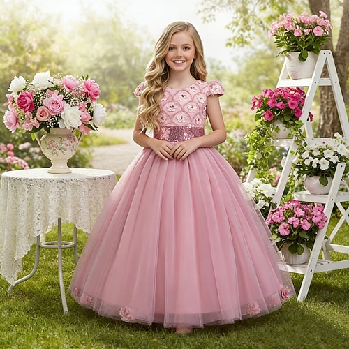 vestito da damigella d'onore abiti da prima comunione abiti da cerimonia per bambine abiti da sposa festa matrimonio formale moda adorabile principessa paillettes ricamato floreale manica corta