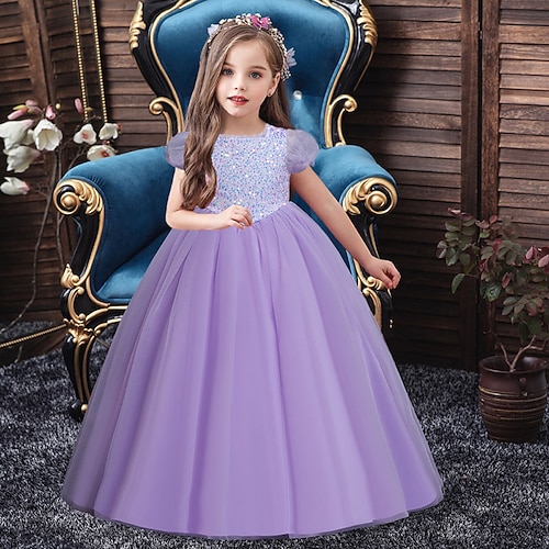 Abito da damigella d'onore bambina Ragazze Abito formale Abiti da sposa Feste Matrimonio Formale Formale Paillettes Patchwork Tinta unica Maniche Corte Girocollo Rosa Azzurro cielo Dai 4 anni in su