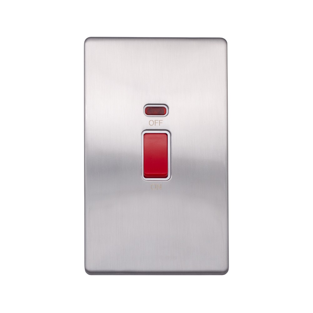 Lieber Brushed Chrome 45A 1 Gang Double Pole Switch & Neon - Large Plate - White Insert Screwless - Size: 146mm x 86mm x 3.1 mm