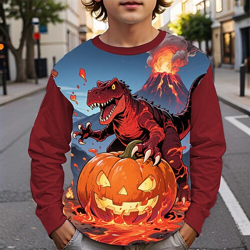 Halloween Jungen 3D Kürbis Dinosaurier T-Shirt Langarm Frühling Herbst Mode Basic Kinder 4-12 Jahre Rundhalsausschnitt Outdoor Lässig Täglich Normale Passform