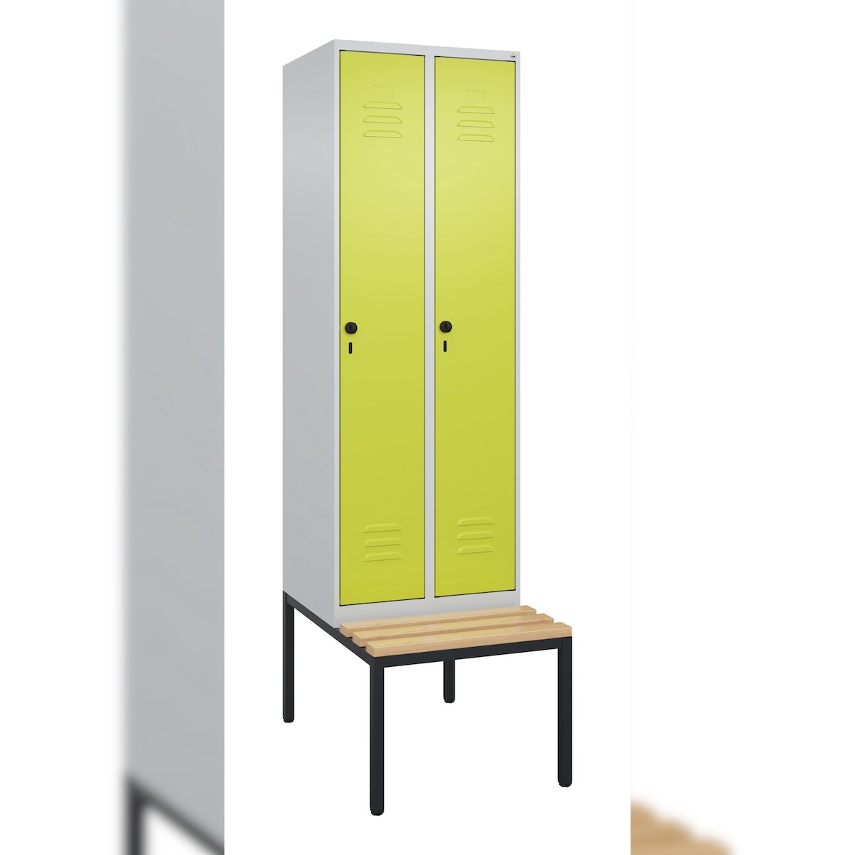 C+P Spind Classic PLUS, Buche untergebaute Sitzbank 2 Abteile, HxBxT 212x60x82cm, Sicherheitsdrehriegel, Hellgrau/Clowngrün von PROREGAL