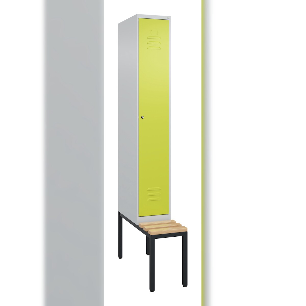 C+P Spind Classic PLUS, Buche untergebaute Sitzbank 1 Abteil, HxBxT 212x30x82cm, Zylinderschloss, Hellgrau/Clowngrün von PROREGAL