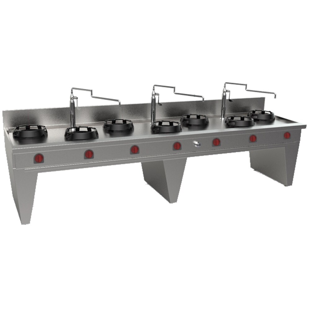EURAST - Gekühltes wok mit 7 gasbrennern 2 träger, 3 wassersäulen - 3500x900x850 mm - 126 Kw - 32359DEM