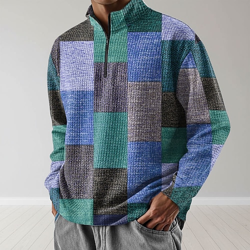 Per uomo Geometrico Plaid Nido d'ape Felpa Moda Quotidiano Classico Casual Collo alla coreana Zip a un quarto Casa All'aperto Ufficio Lavoro Blu Verde Cachi Grigio Con zip Autunno Inverno progettista
