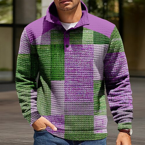 Per uomo Geometrico Plaid Nido d'ape Felpa Moda Quotidiano Classico Casual Collo alla coreana Zip a un quarto All'aperto Casa Ufficio Lavoro Blu Viola Verde Cachi Con zip Autunno Inverno progettista