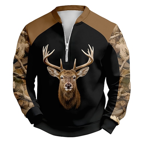 Per uomo Animale Cervo Pile Felpa Moda Casual 3D Da caccia Collo alla coreana Zip a un quarto All'aperto Abbigliamento casual alla moda Vacanza Regalo Marrone Cachi Grigio scuro Grigio Mezza cerniera