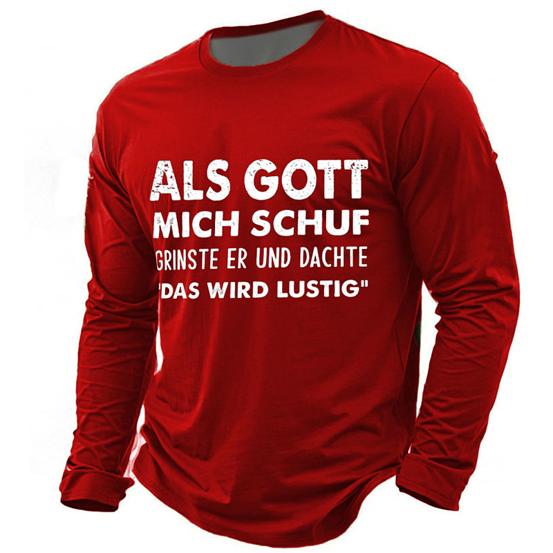 Maglietta grafica a maniche lunghe da uomo divertente slogan tedesco 'Quando Dio mi ha creato ha sorriso e pensato che sarebbe stata un'avventura divertente'