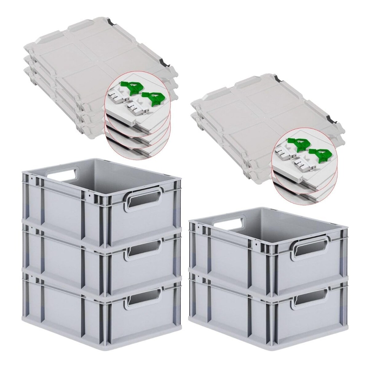 PROREGAL SparSet 10x Eurobox NextGen Economy mit Auflagedeckel & 4x Verschlüsse Grün, Griffe offen, HxBxT 17x40x60cm, 34L, Eurobehälter, Box