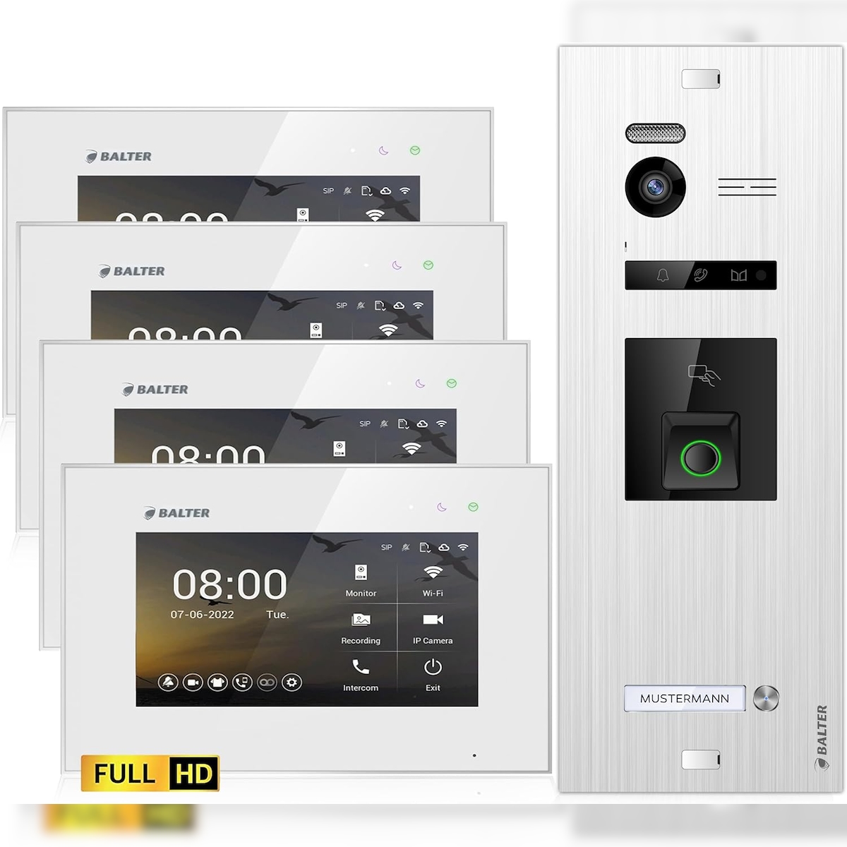 HD Video Türsprechanlage mit Fingerprint RFID und Smartphone App für 1 Familienhaus, 4x Monitore, Balter EVO HD Fingerprint