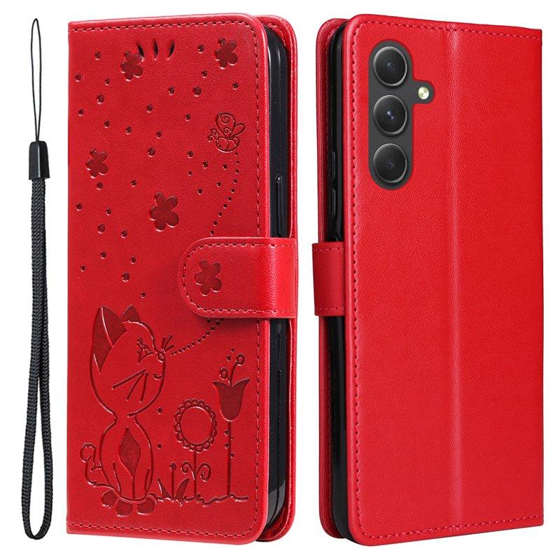 Samsung Galaxy A55 5G Plånboksfodral Konstläder Cat Bee Mönster - Röd