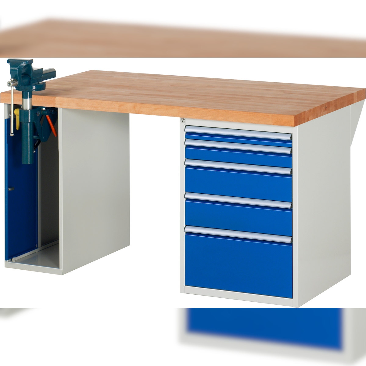 Werkbank, Baukastensystem Serie 7000, 5 Schubladen, 1 Schraubstock linksseitig, BxT 1500 x 900 mm eurokraft pro