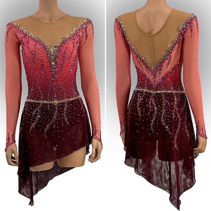Figure Skating Dress Women's Girls' Ice Skating Dress Burgundy Patchwork Open Back Mesh Spandex High Elasticity Training Competition Skating Wear Classic Crystal / Rhinestone Long Sleeve Ice Skating
