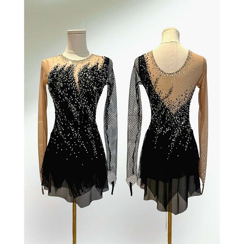 Figure Skating Dress Women's Girls' Ice Skating Dress Black Patchwork Asymmetric Hem High Elasticity Training Competition Skating Wear Classic Crystal / Rhinestone Long SleeveIce Skating Figure
