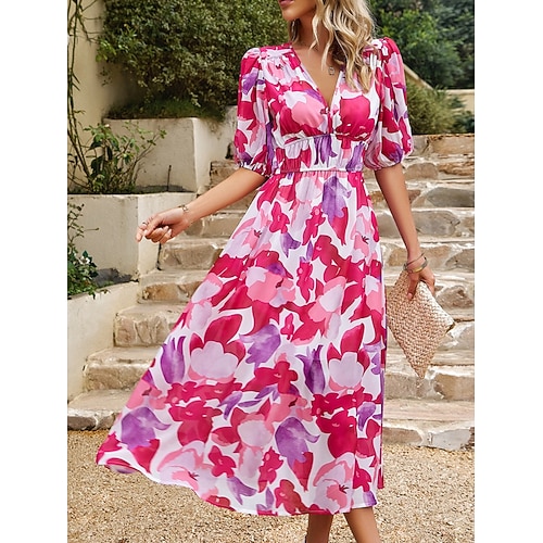 Per donna Abito Midi Abito a trapezio Vacanza Casual All'aperto Uscire Vestibilità regolare Floreale Manica Corta Scollo a V Blu Nero Verde chiaro Rosso Estate Primavera