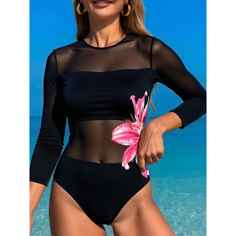 Women's One Piece Swimsuit Sexy Cutout Monokini Mesh Tummy Control High Waist Slim Vacation Beach Wear Floral Round Neck Long Sleeve Bathing Suits
