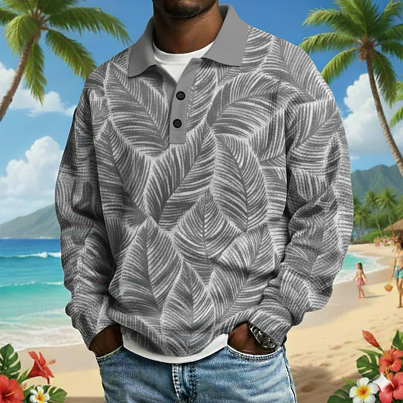 Men's Leaf Waffle Polo Shirts Long Sleeve Polo Shirts Lapel Resort Athleisure Hawaiian Daily Wear 3D Print Spring Fall Winter Blue Yellow Pink