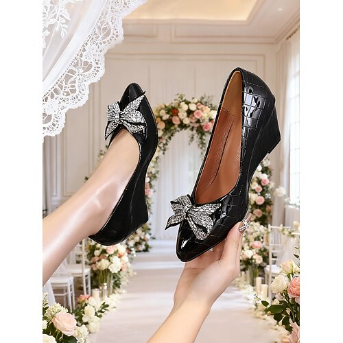 Silberne Metallic-Keilpumps für Damen mit Strass-Schleife, elegante, geschlossene Brautschuhe, bequeme, glänzende Schuhe für die Trauung