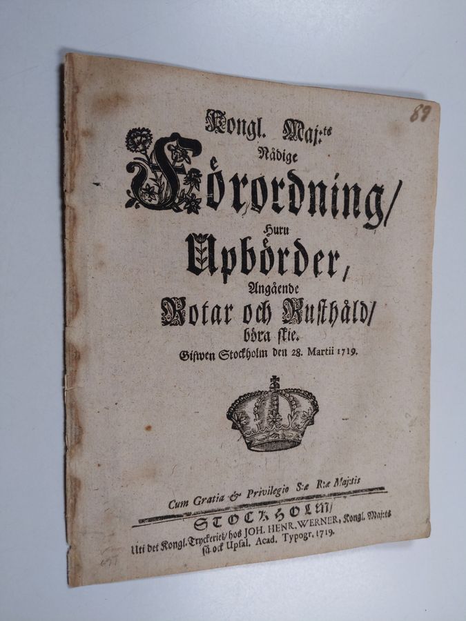 Kongl. Maj:ts Nådige Förording, Huru Upbörder, Angående Rotar och Rusthåld, böra skie. Gifwen Stockholm den 28. martii 1719