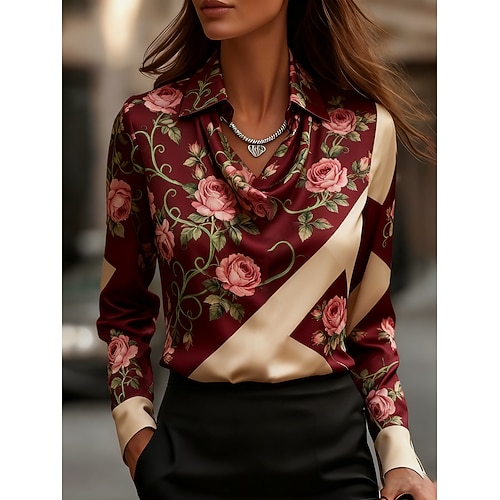 Per donna Camicia Floreale Elegante Casual Manica Lunga Scollo a Cascata Top Regolari Lavoro Quotidiano Ferie Stampato Drappeggiato Vino Primavera Autunno