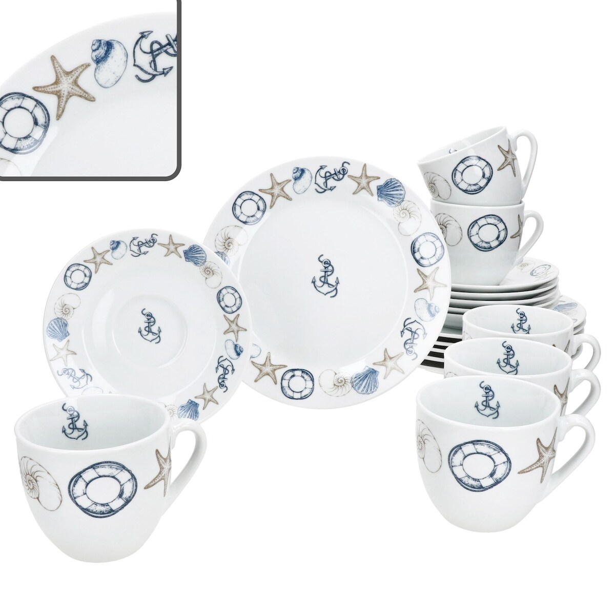 Neptun 18tlg Kaffeeservice Porzellan 6Pers Tasse Untertasse Teller Anker maritim