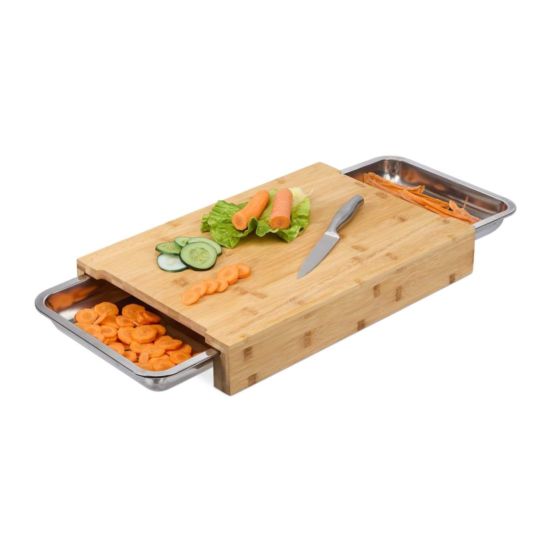 Bambu-leikkuulauta, jossa mehuurat ja 2 alustaa