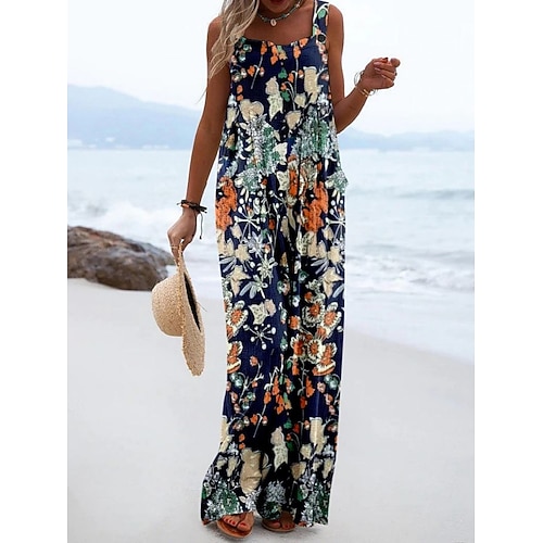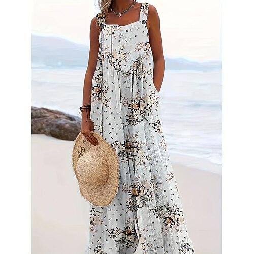 Per donna Salopette Attivo Floreale Senza Maniche Senza maniche Gamba larga Collo quadrato Tasca Bottoni Quotidiano Spiaggia Vestibilità comoda Blu Rosa Cachi Estate