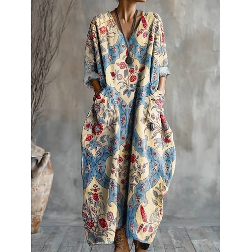 Per donna Abito maxi Abito a trapezio Vacanza Casual Quotidiano Vestibilità comoda Floreale Grafico Manica Lunga Scollo a V Blu Arancione Estate Primavera