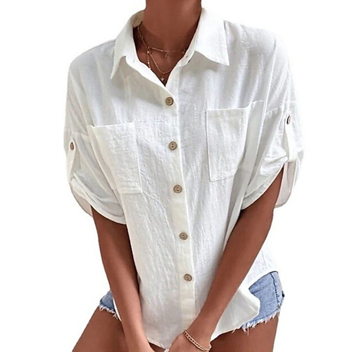 Per donna Taglie Forti Camicie ispirate al lino Abbottonare Blusa Tinta unica Casual Manica Corta Collo Alto Top Regolari Bottoni Bianco Primavera, Autunno, Inverno, Estate