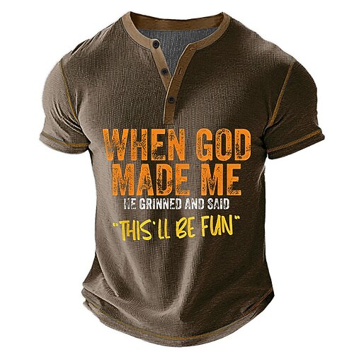 T-Shirt Grafica a Maniche Corte Henley per Uomini 'Quando Dio Mi Ha Creato Ha Sorriso E Ha Detto Sarà Divertente'