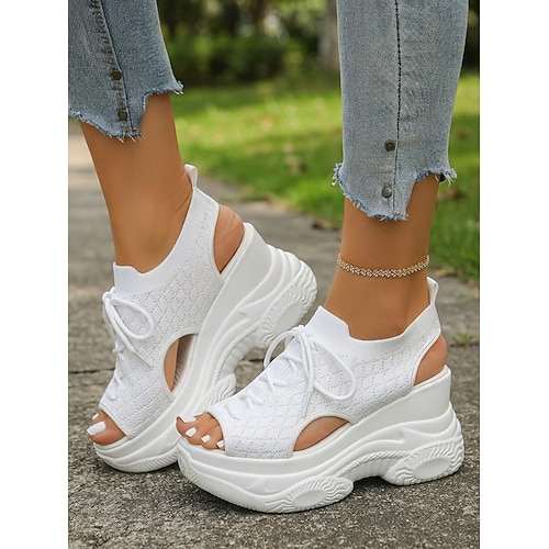 sandali da donna in Flyknit bianco con plateau e tomaia traspirante e chiusura con lacci, design sportivo alla moda per uscite casual, streetwear, avventure estive e uso quotidiano