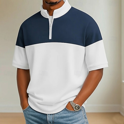 Per uomo Polo Casuale Ferie Colletto Mao Manica Corta Essenziale Moderno Plaid Blocco di colori Blocco di colore Bottoni Blu Nero Giallo Blu marino Grigio Polo