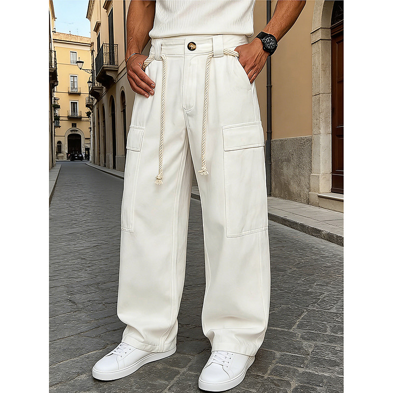 Men's Cargo Pants Trousers Baggy Pants Drawstring Multi Pocket Flap Pocket Plain Windproof Comfort Daily Outdoor Holiday Vacation Streetwear Black White Inelastic