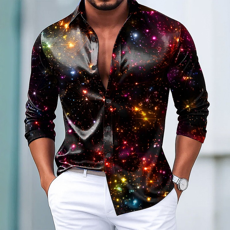 Christmas Men's Sparkling Glitter Happy New Year Christmas Light Shirt Satin Shirt Dress Shirt Long Sleeve Fashion Casual Party Holiday Summer Spring Fall Turndown 3D Print Button Up Shirts Blue