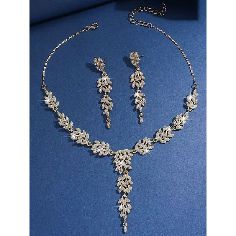 Women's Gold Rhinestone Leaf Necklace and Earring Set - Elegant Sparkly Jewelry for Party and Evening Occasions