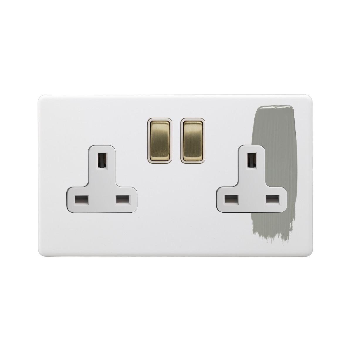 Soho Lighting Primed Paintable 2 Gang Socket 13A Double Pole with with Brushed Brass Switch with White Insert - Size: 86mm x 146mm x 4.5mm