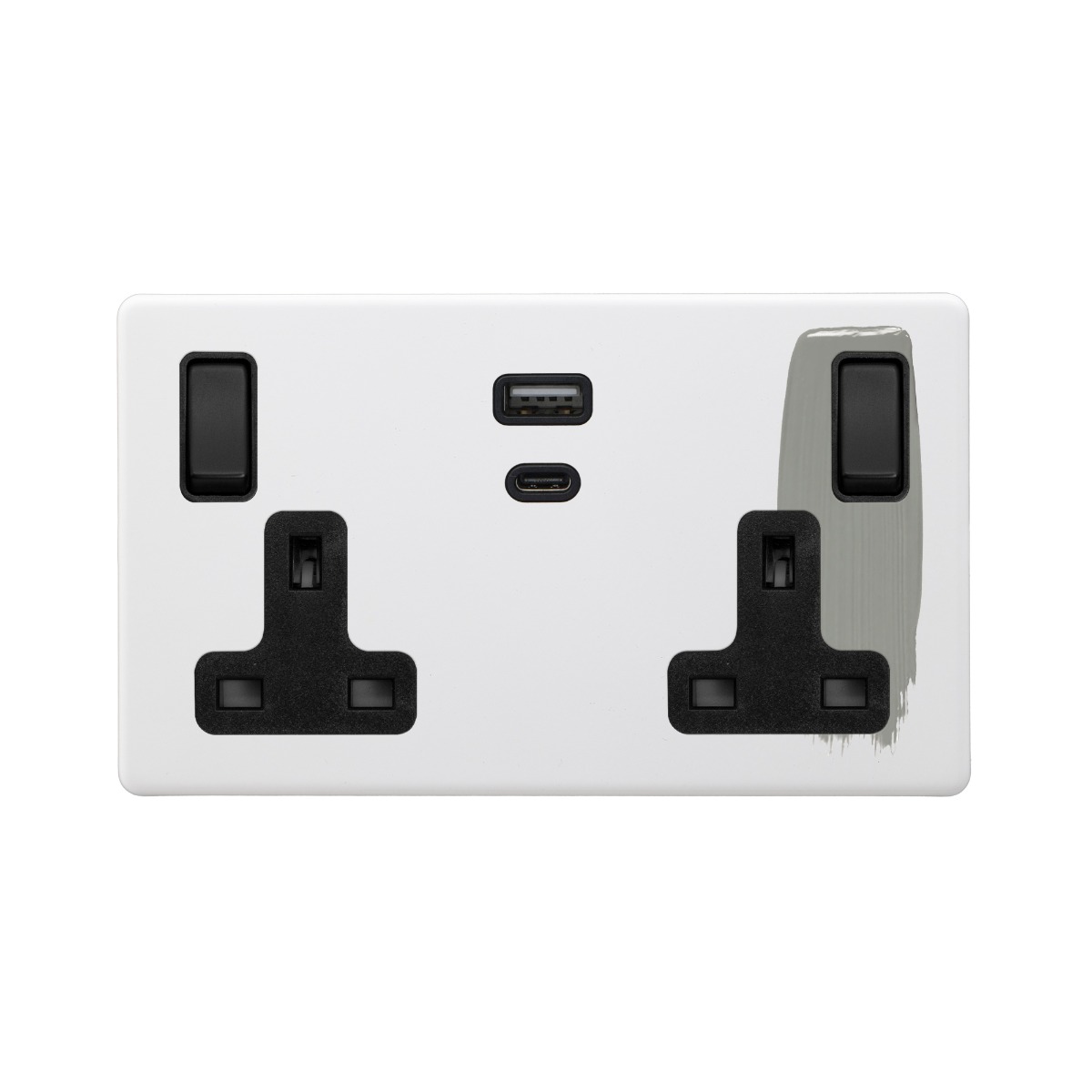 Soho Lighting Primed Paintable 13A 2 Gang Super Fast Charge 45W USB A+C Socket with Matt Black Switch - Size: H 86mm X W 146mm X D 4.5mm